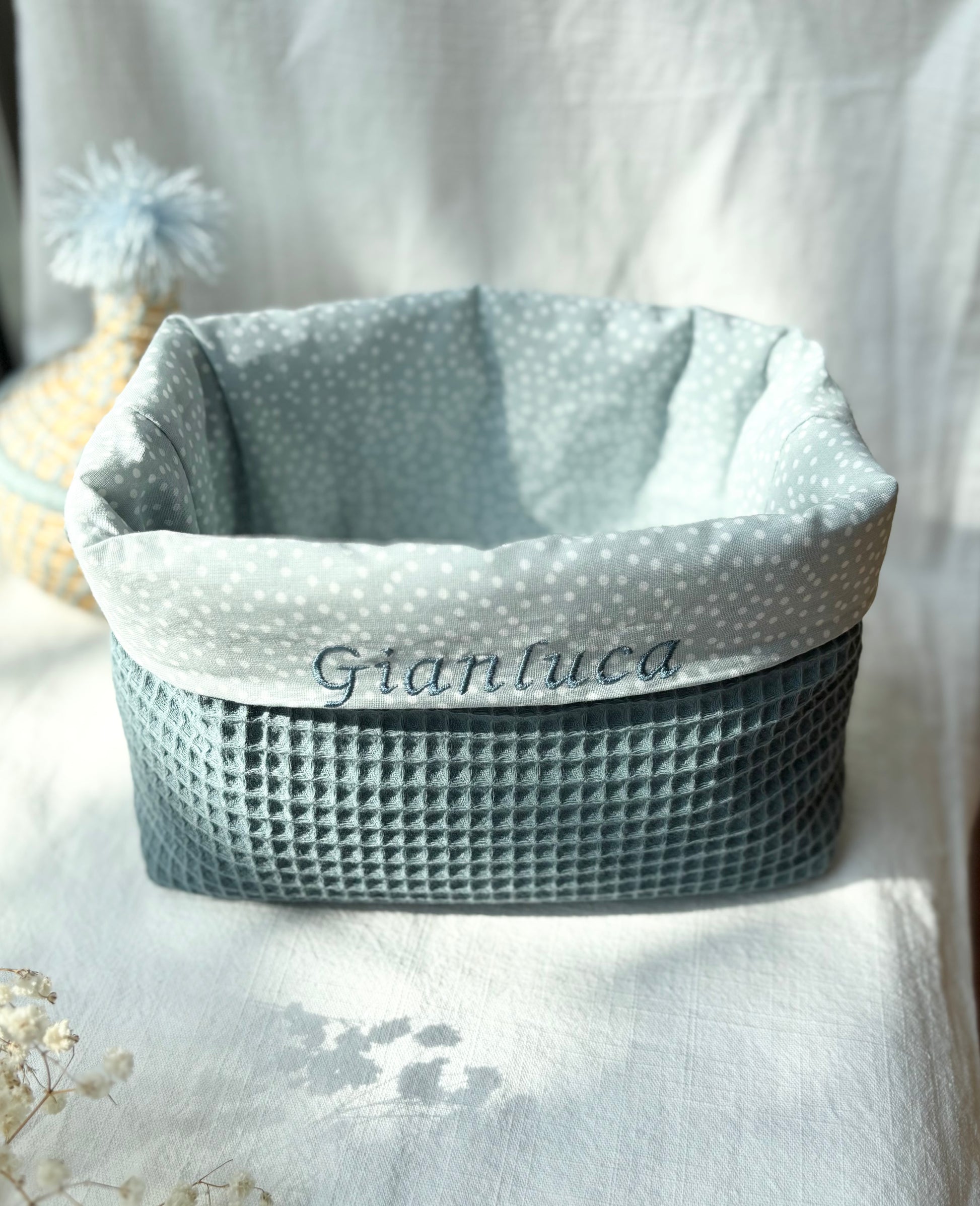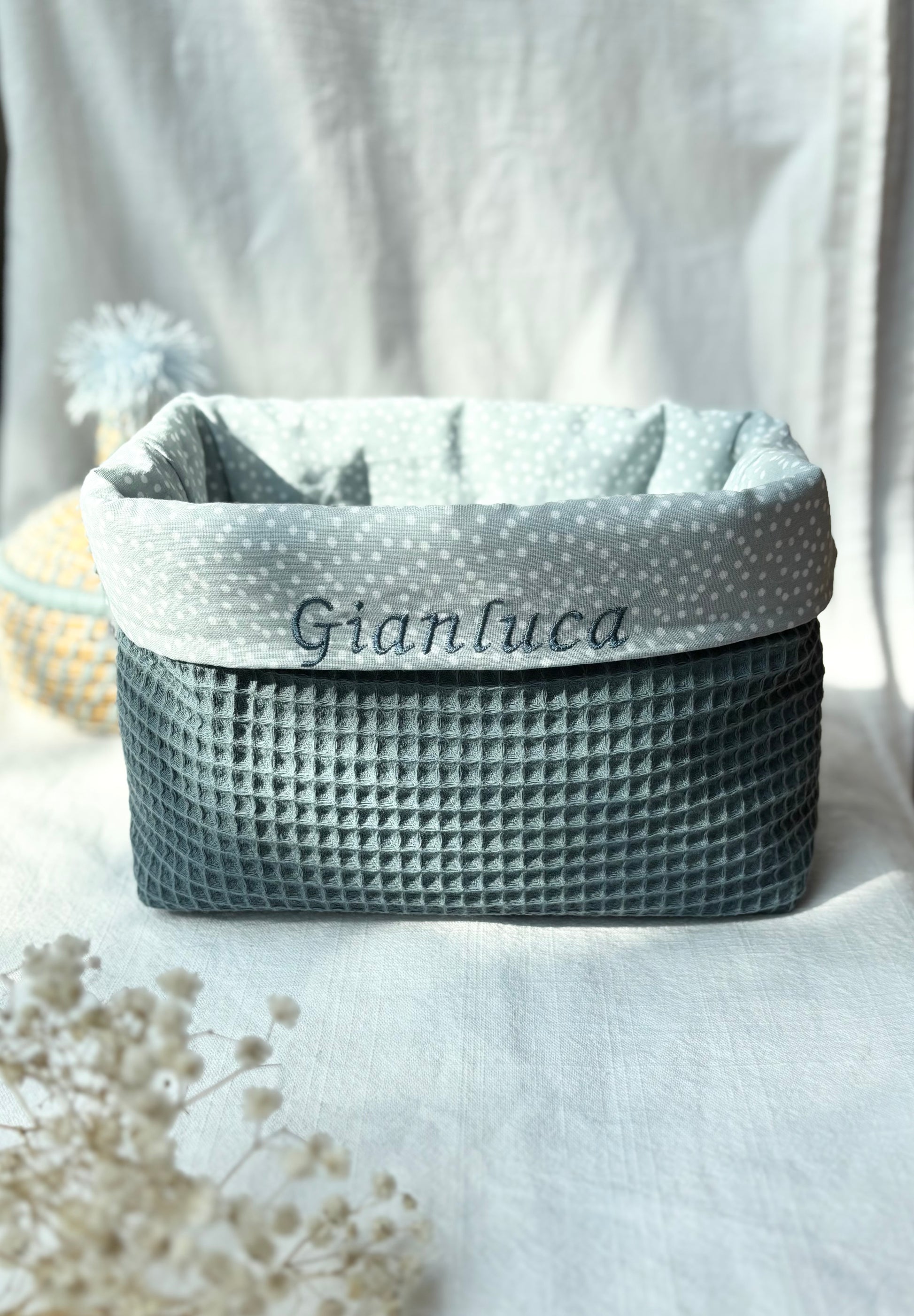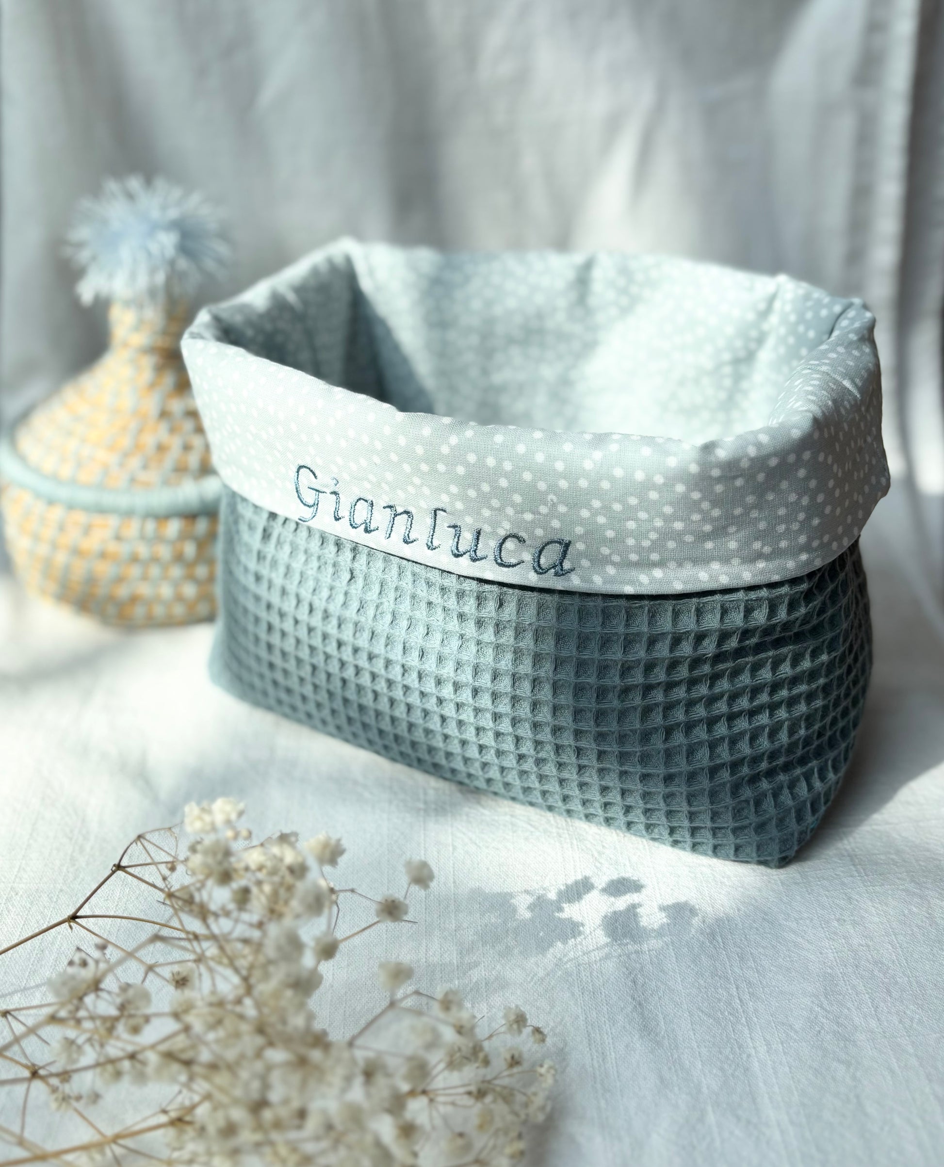 Cestino in cotone e spugna nido d’ape personalizzato con nome, realizzabile con qualsiasi nome.
