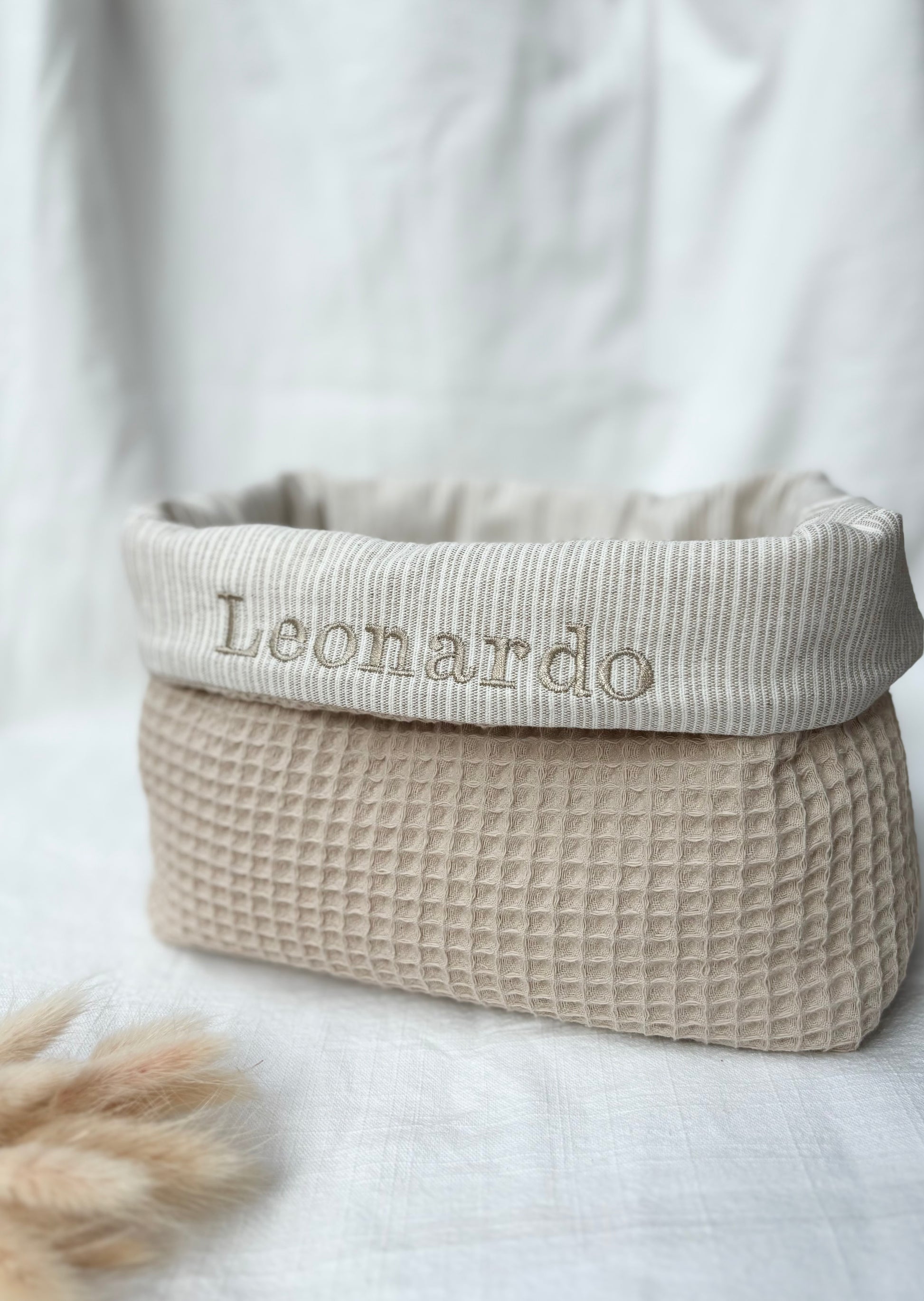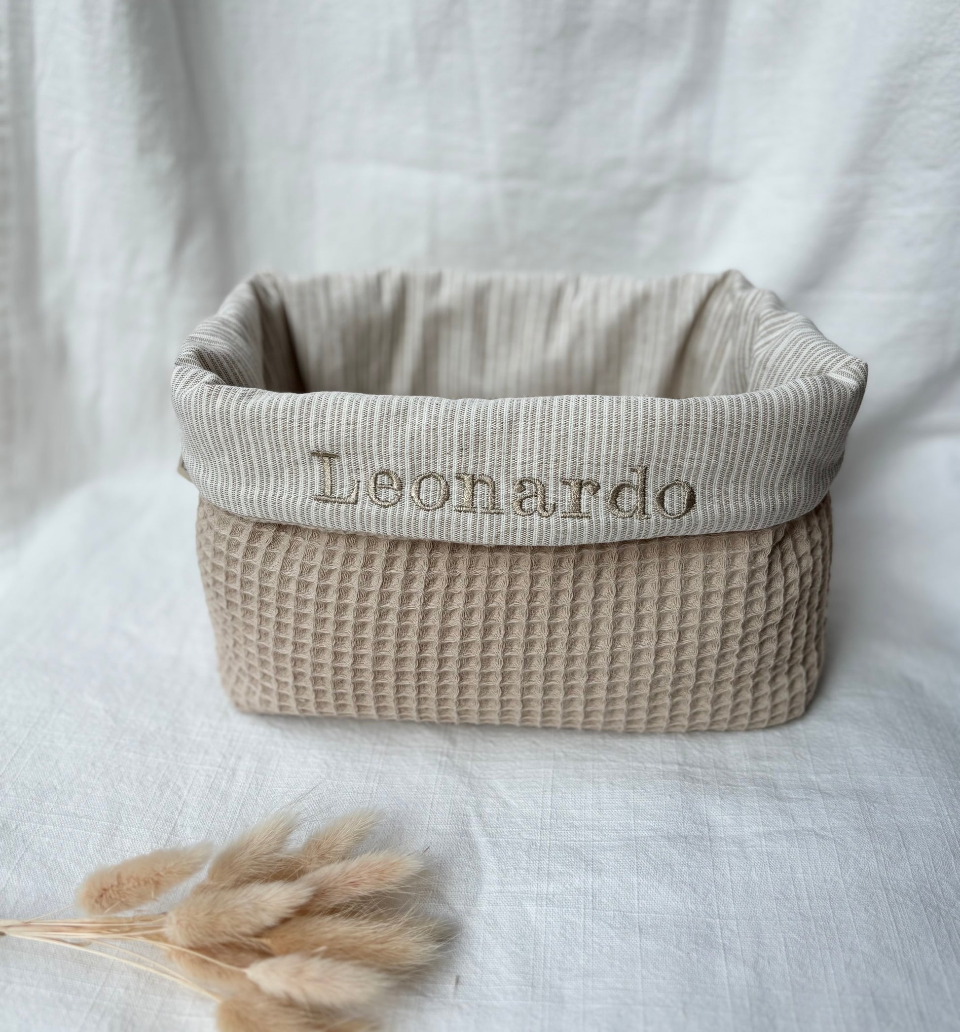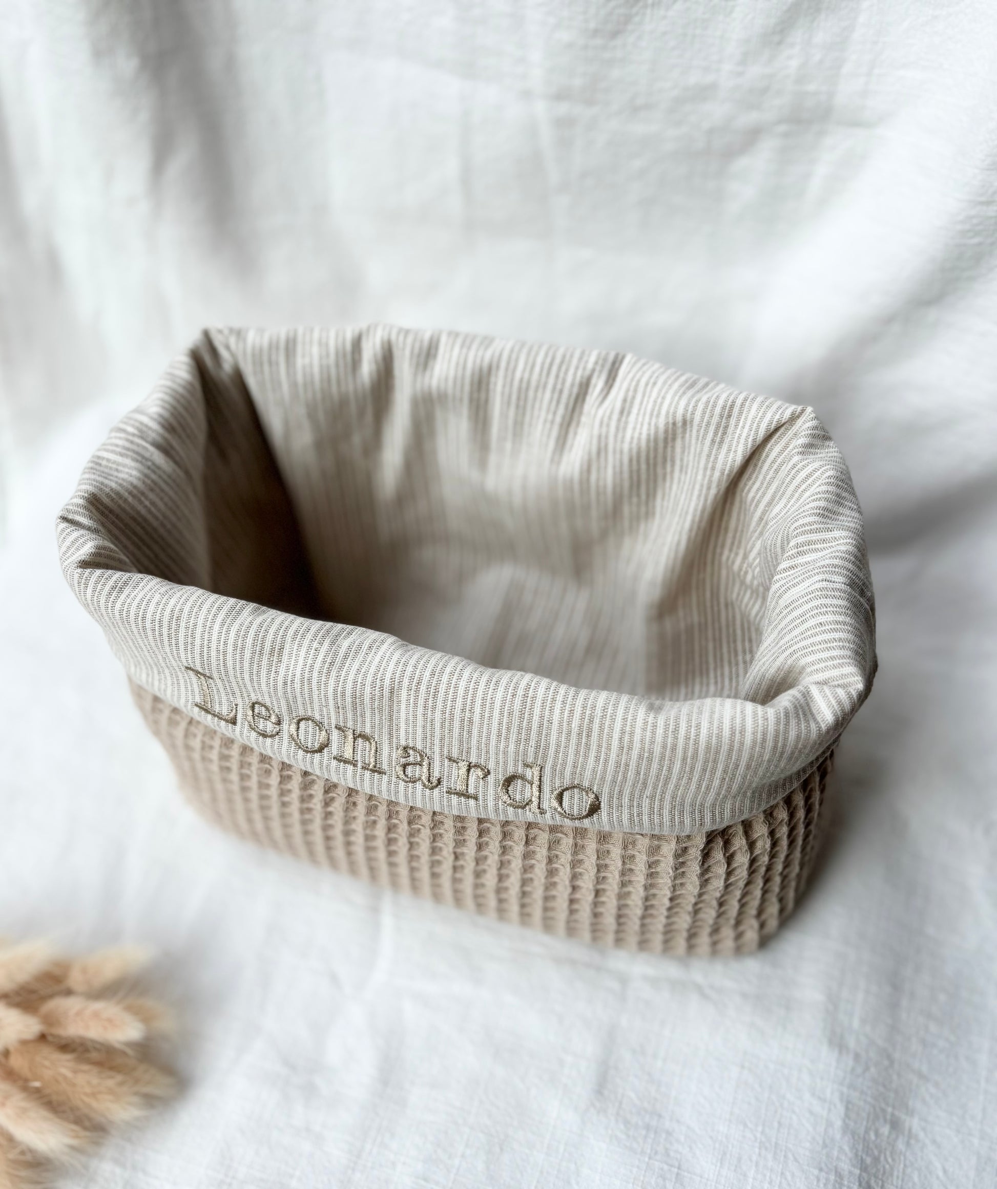 Cestino in cotone e spugna nido d’ape personalizzato con nome, realizzabile con qualsiasi nome o iniziali.