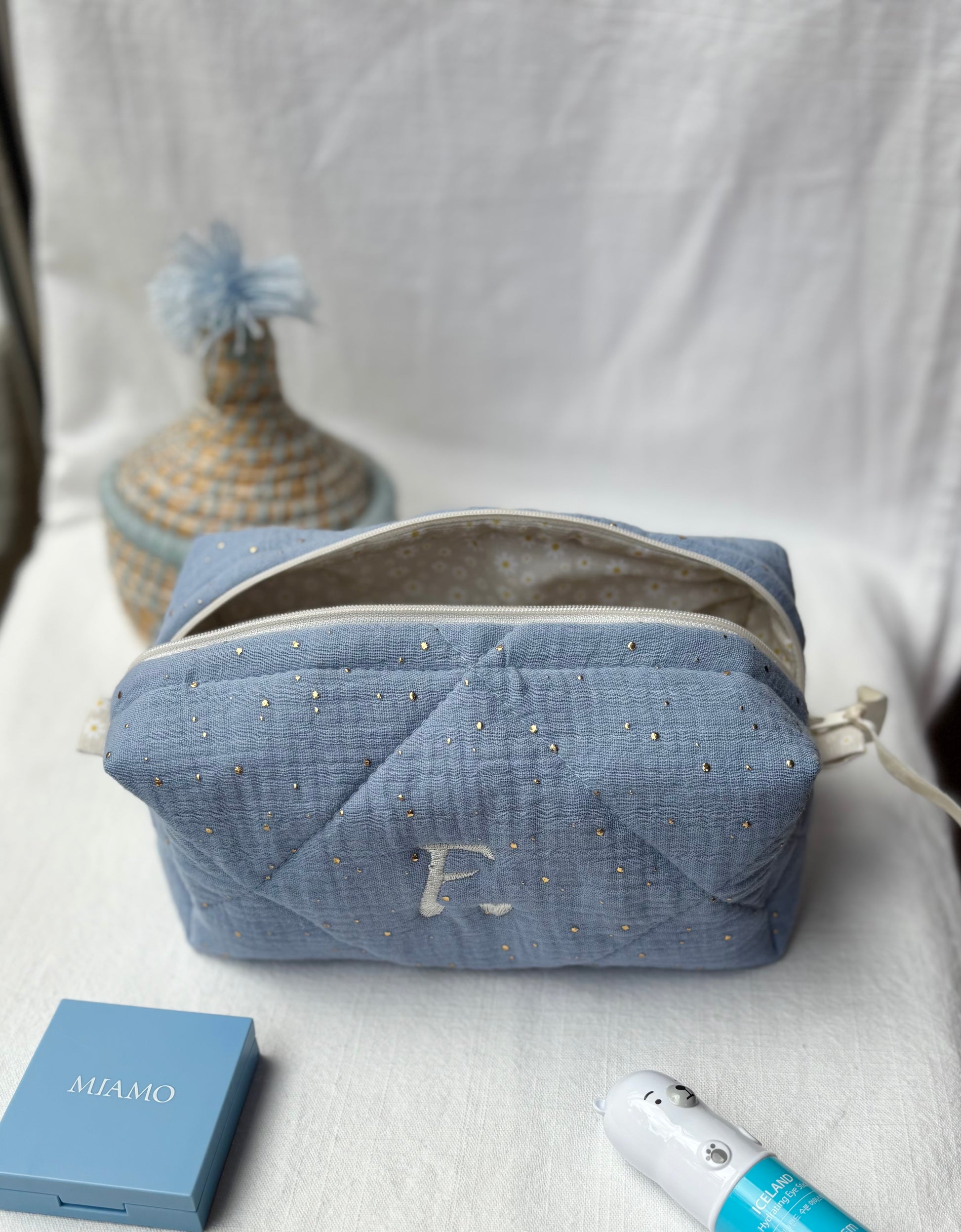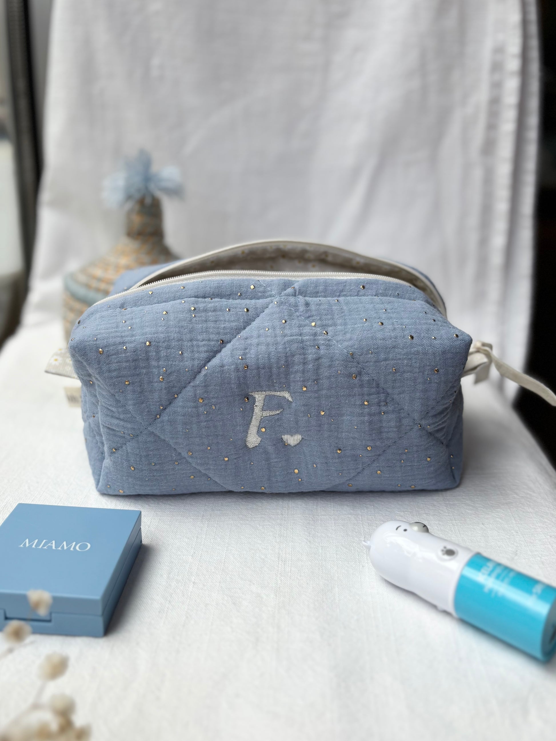 Cubotto in mussola di cotone, personalizzato con iniziale F, realizzabile con qualsiasi iniziale o nome.