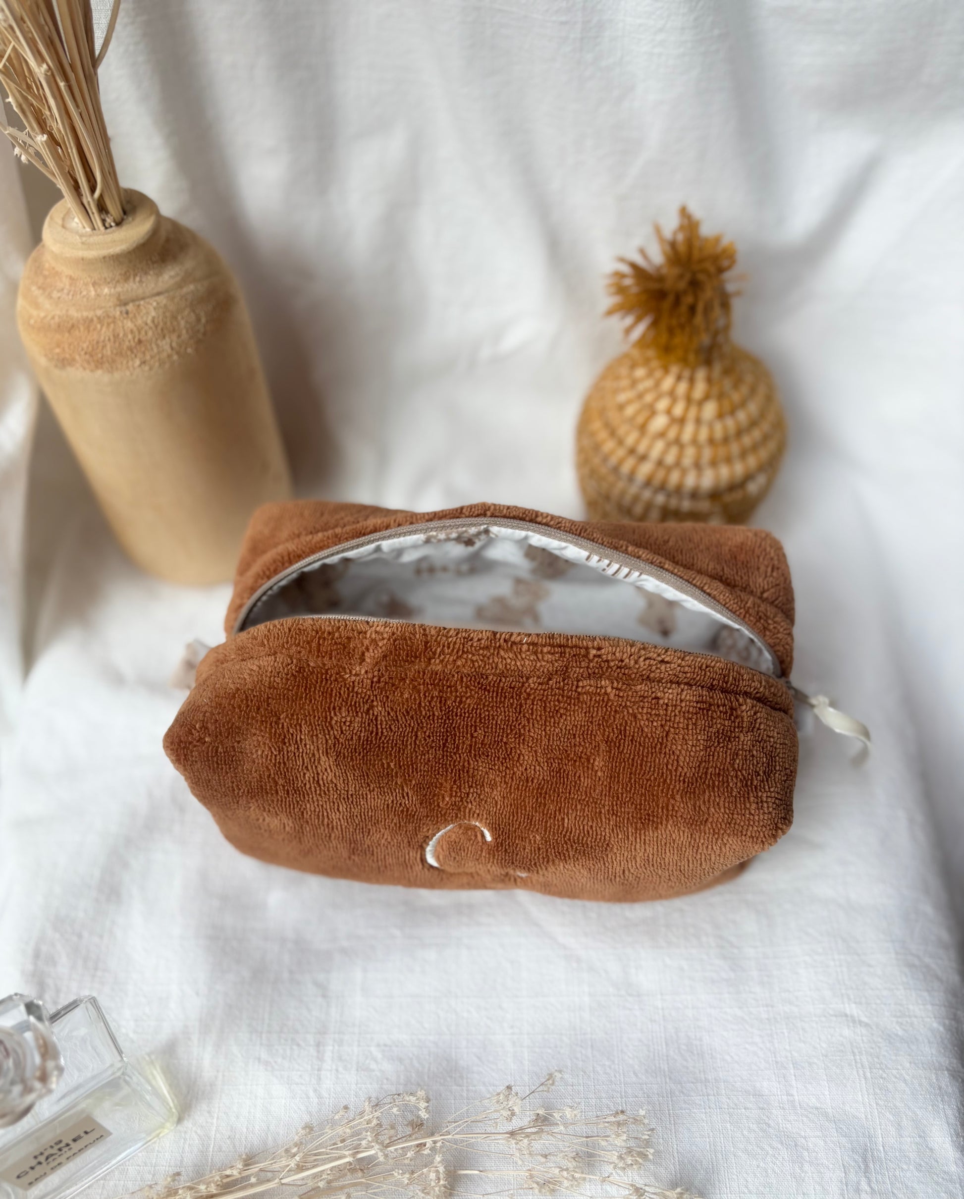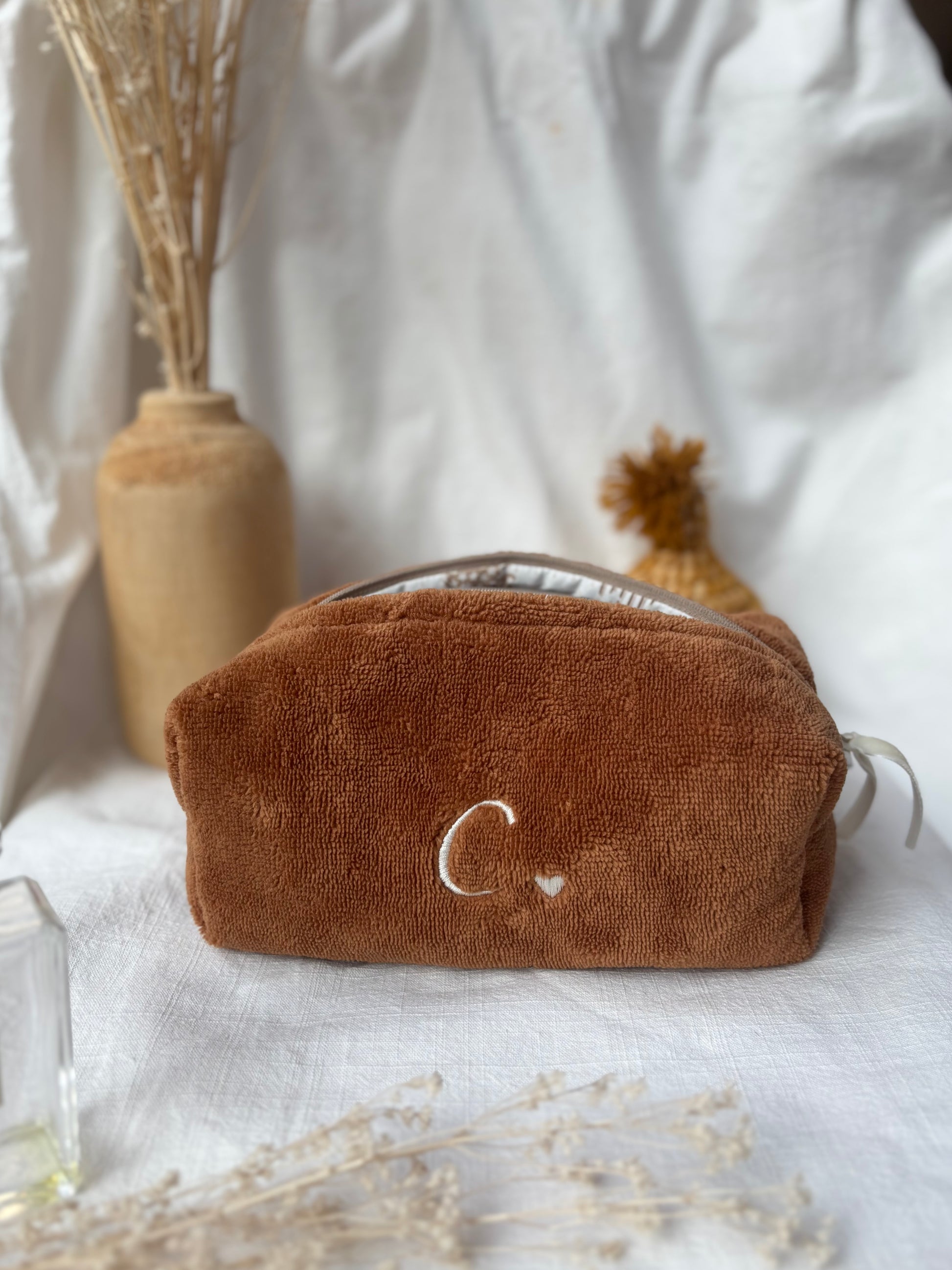 Cubotto in spugna bamboo marroncino, personalizzato con iniziale C, realizzabile con qualsiasi iniziale o nome.