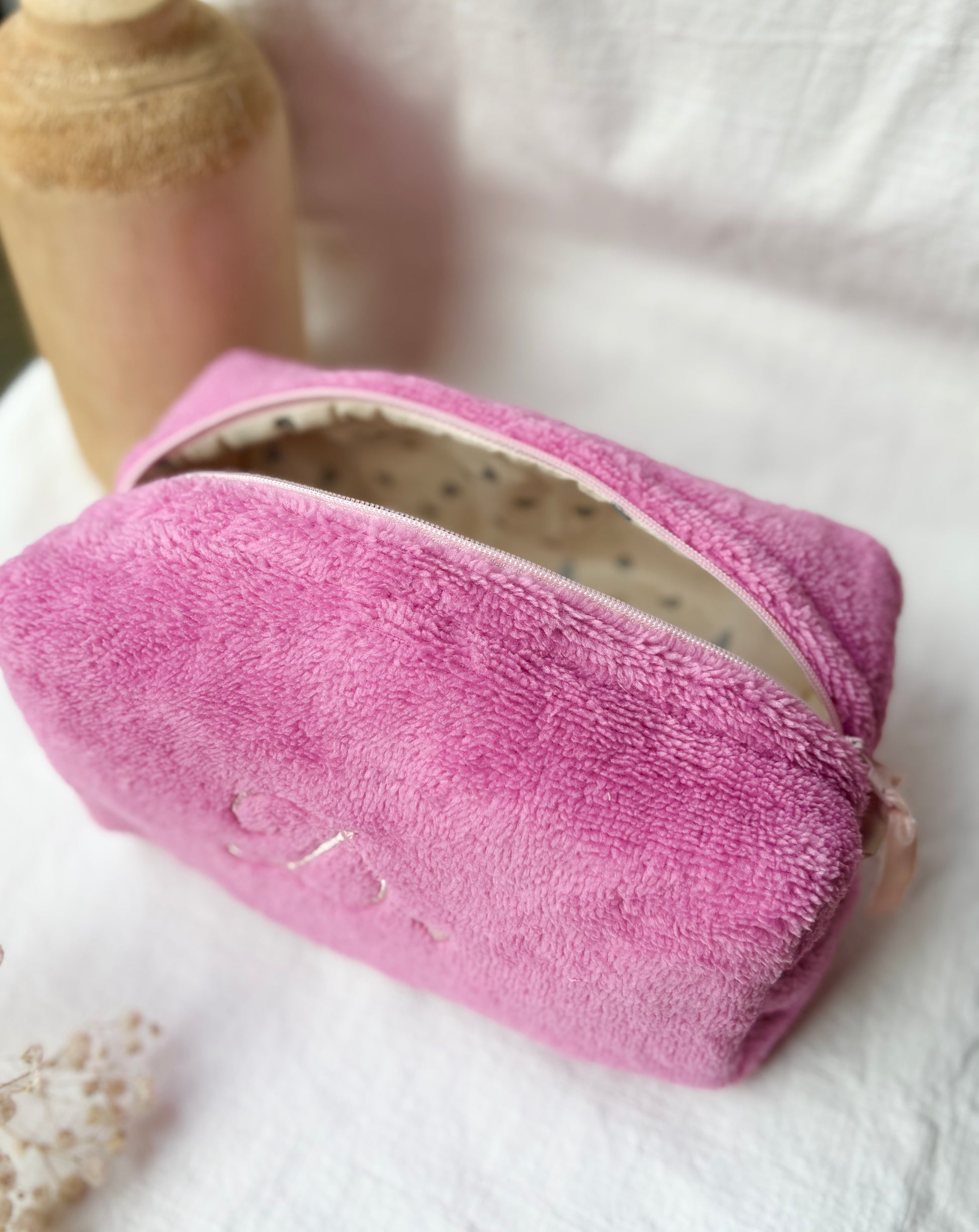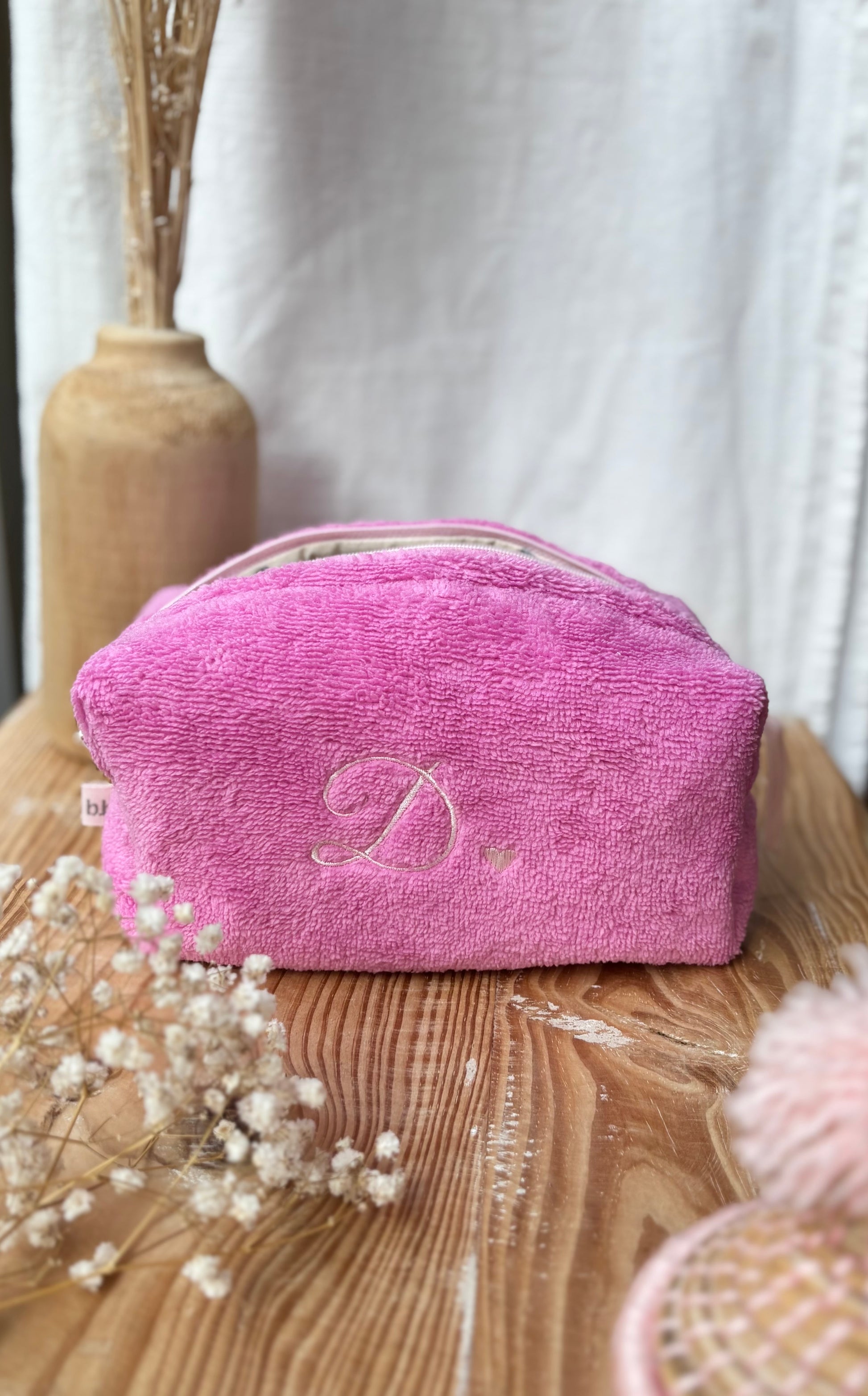 Cubotto in spugna bamboo rosa personalizzata con iniziale D, realizzabile con qualsiasi iniziale o nome.