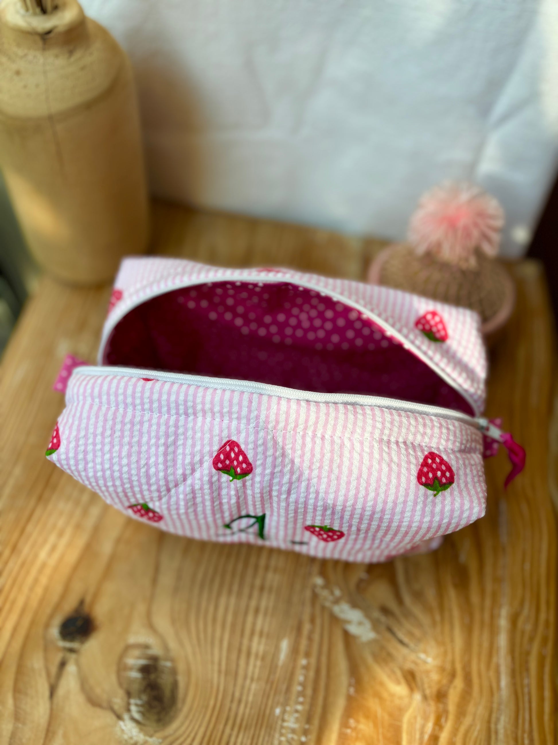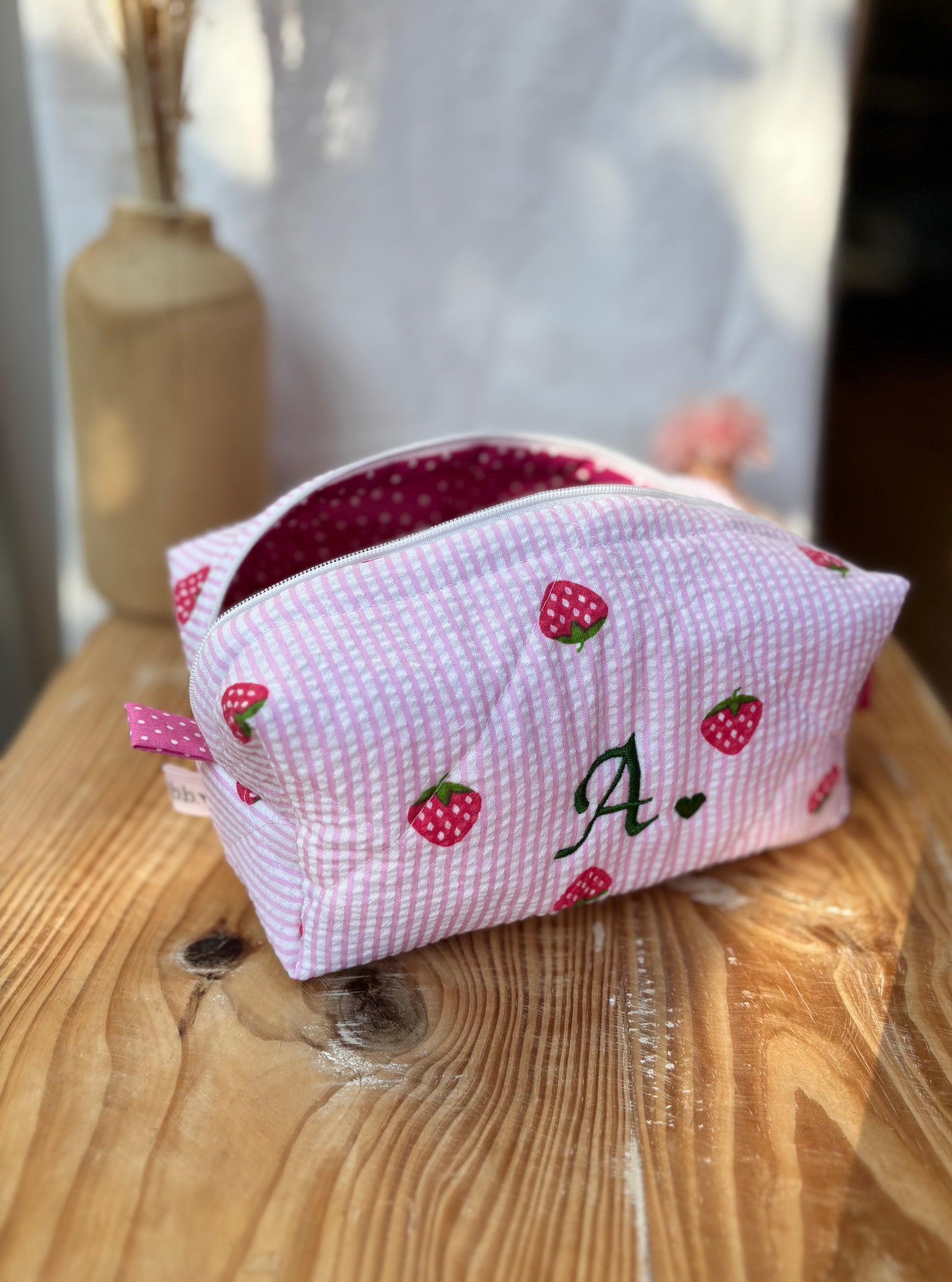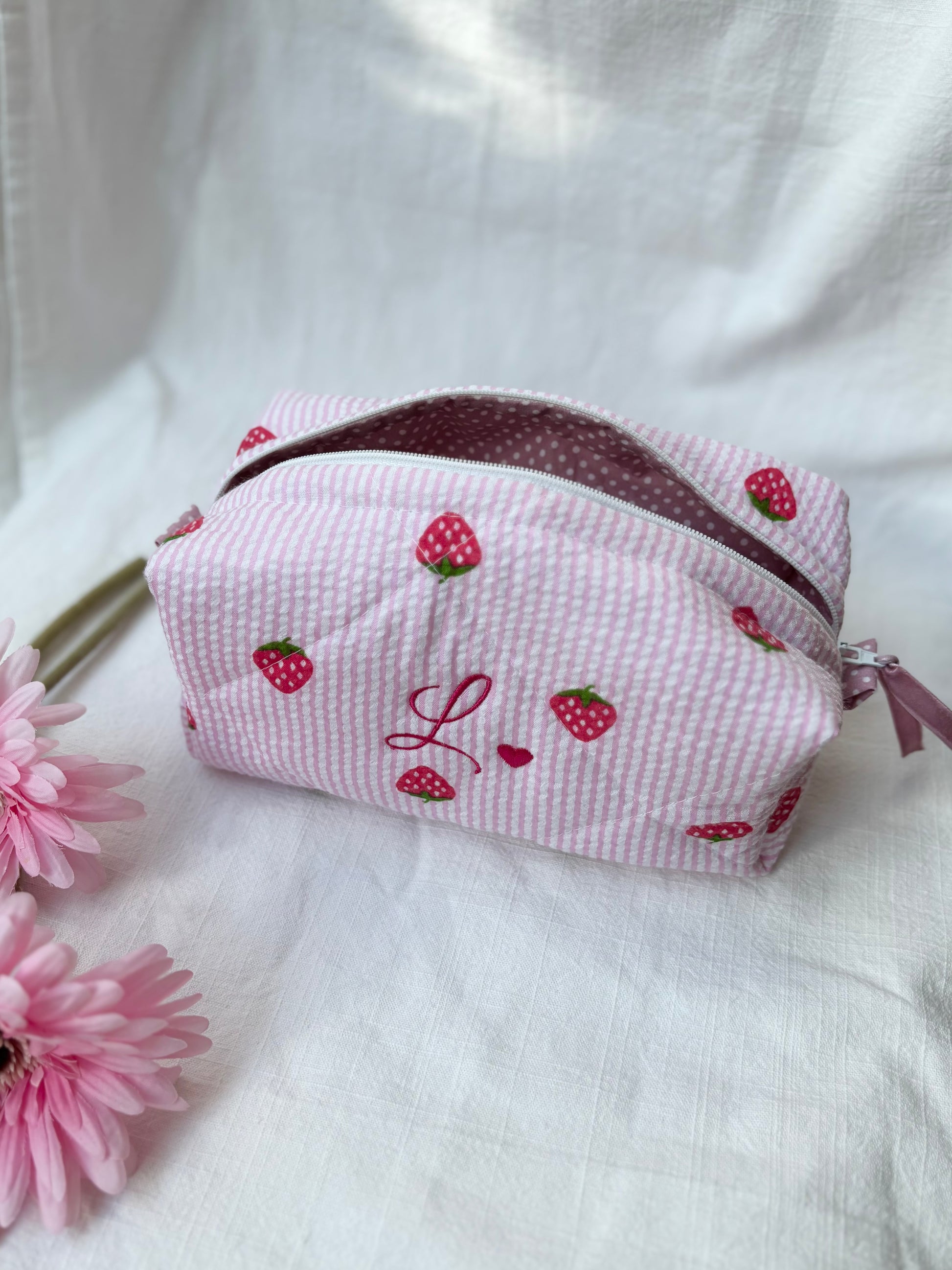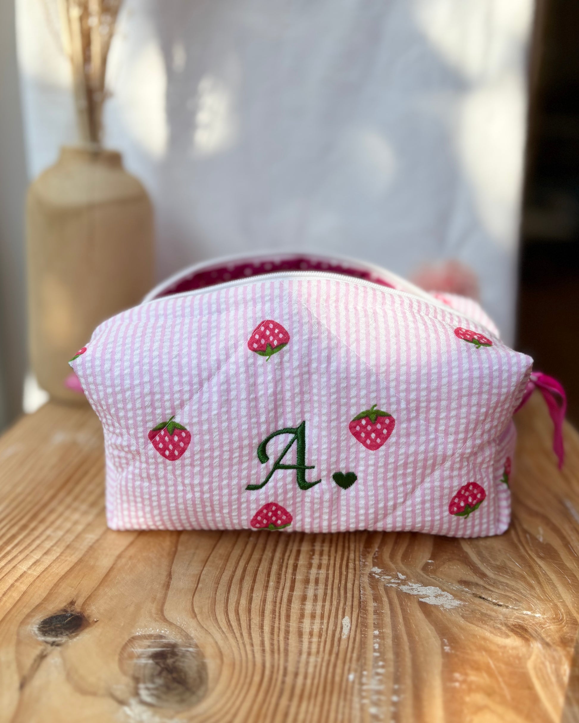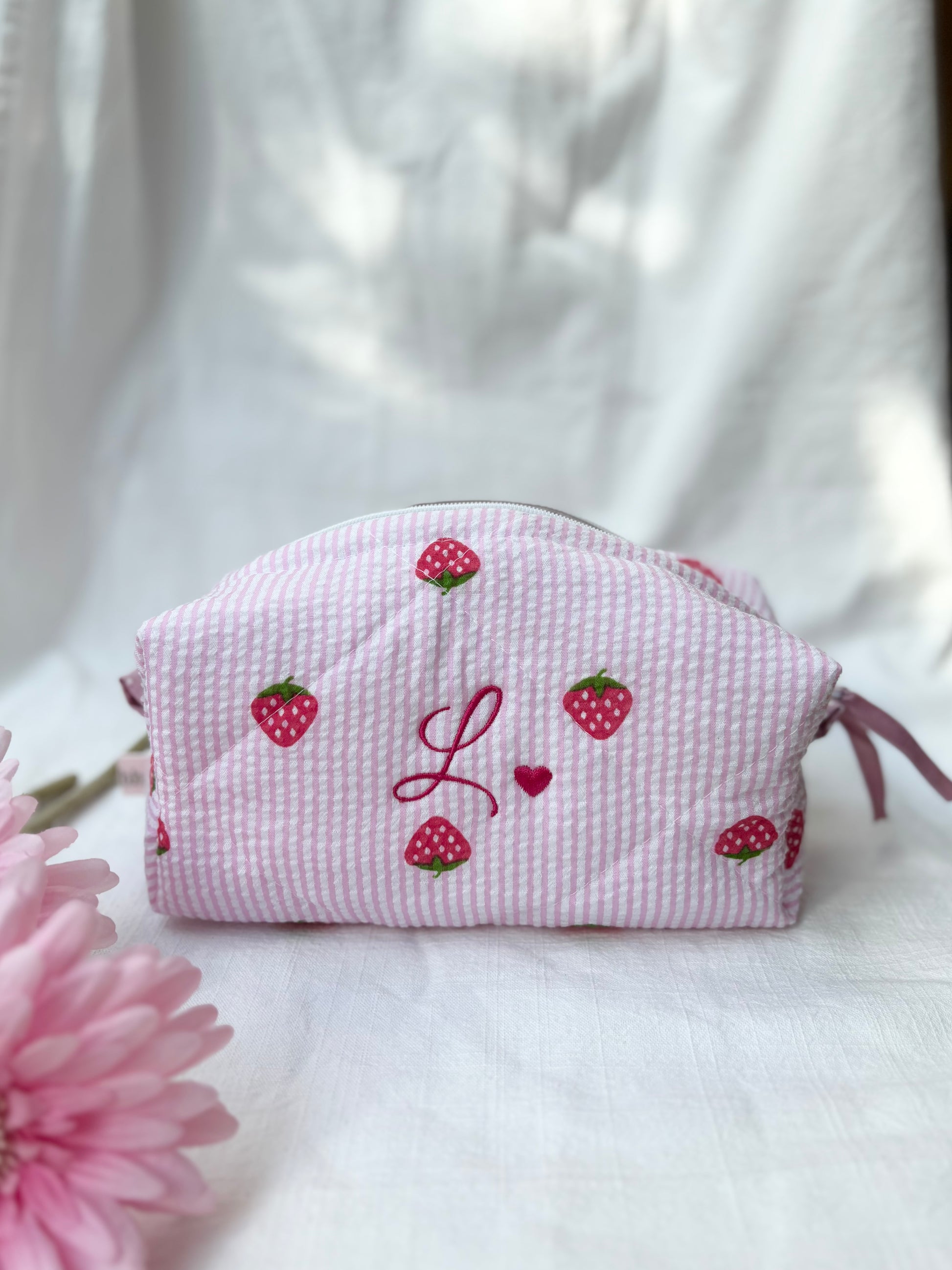 Cubotto in tessuto seersucker rosa e fragole personalizzato con iniziale L, realizzabile con qualsiasi iniziale o nome.