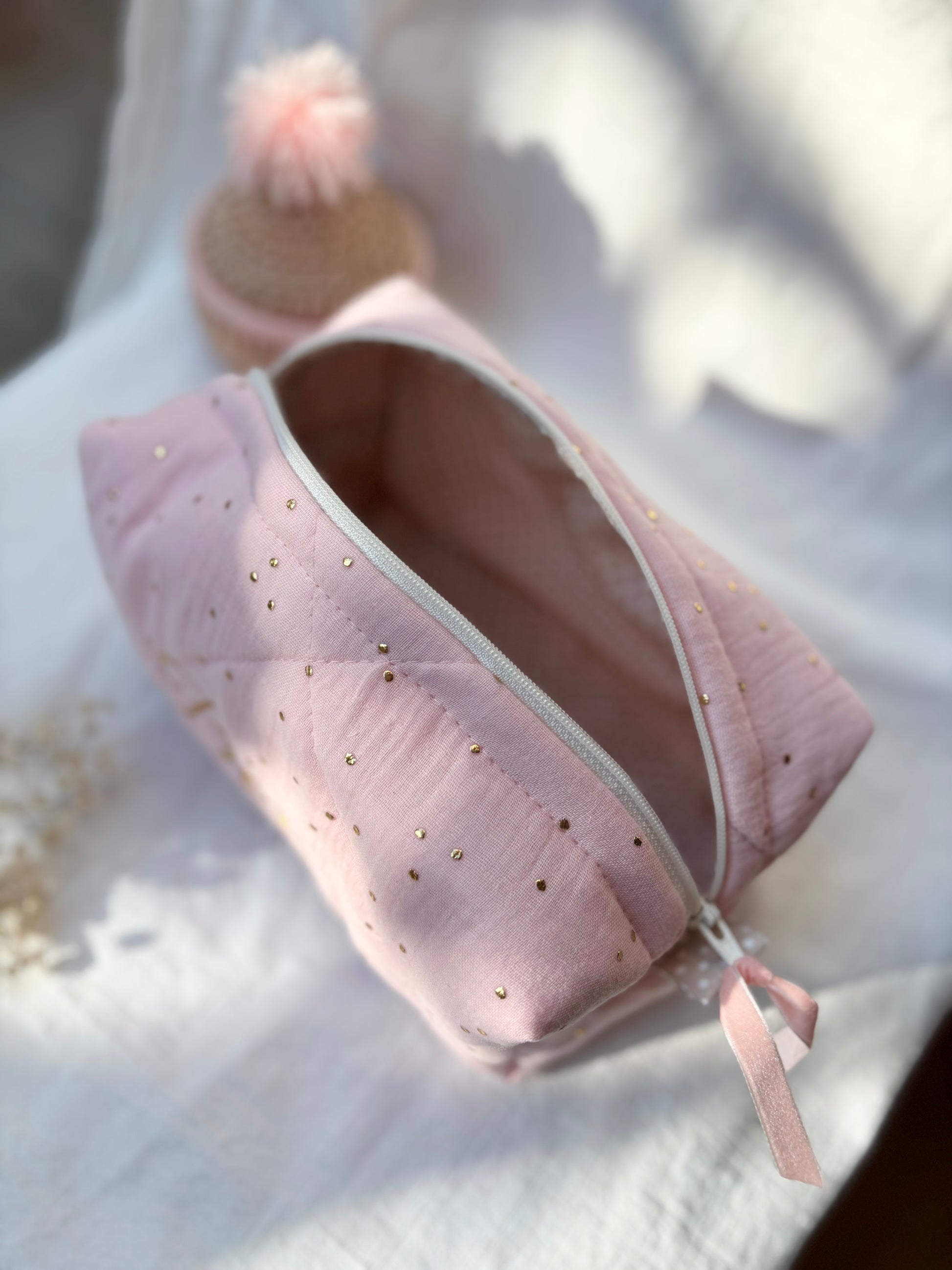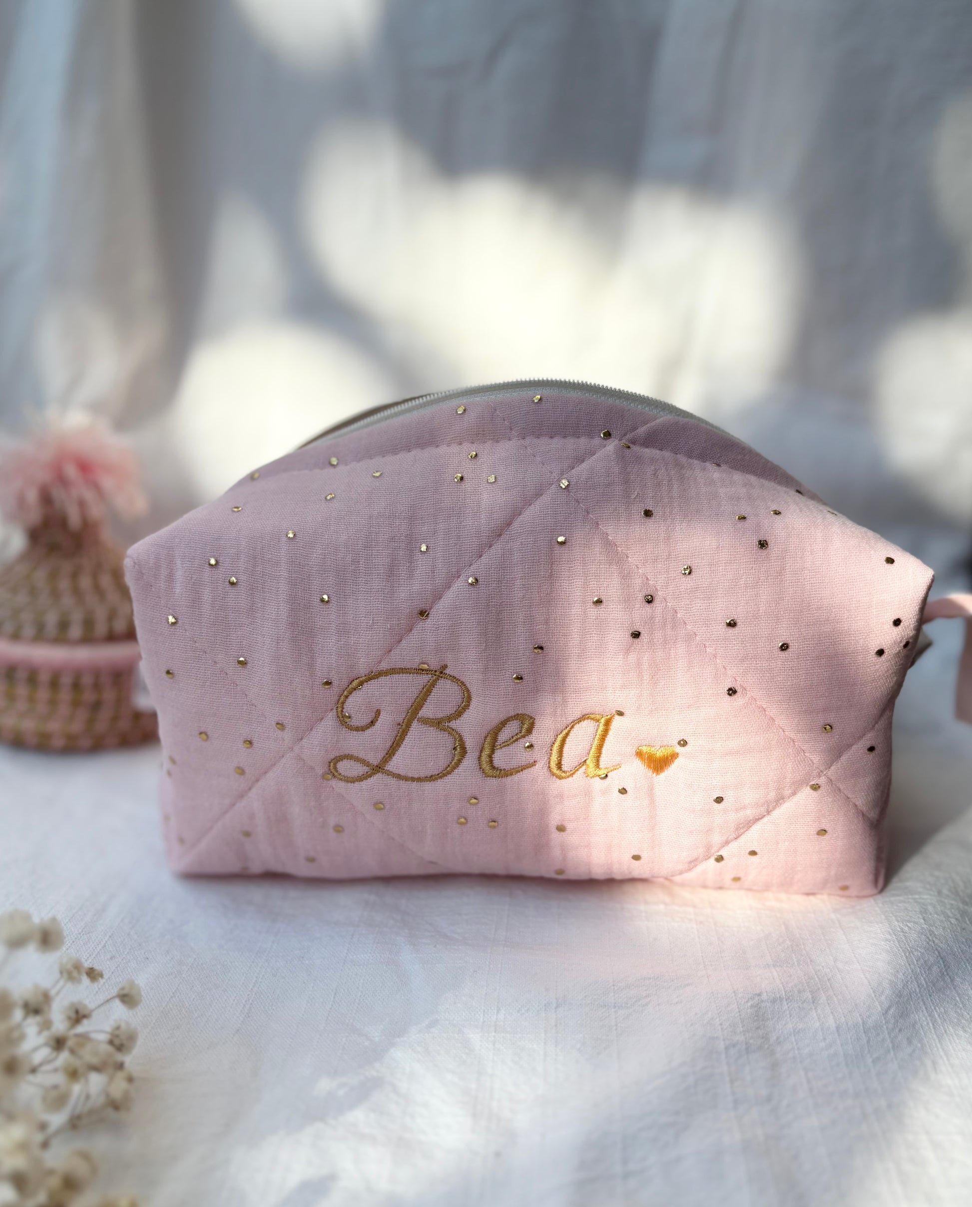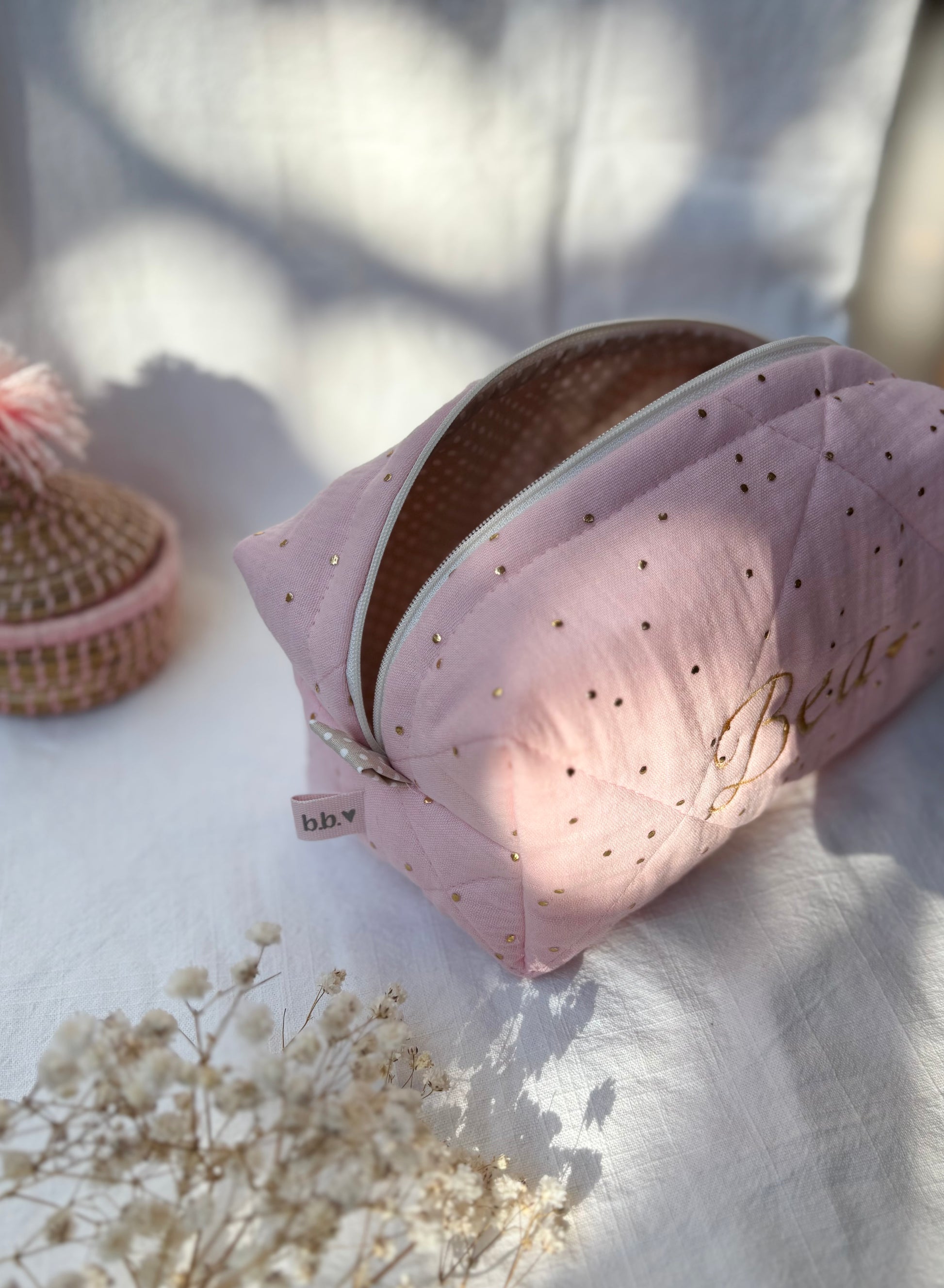 Cubotto in mussola di cotone rosa trapuntata personalizzata con iniziale B, realizzabile con qualsiasi iniziale o nome.