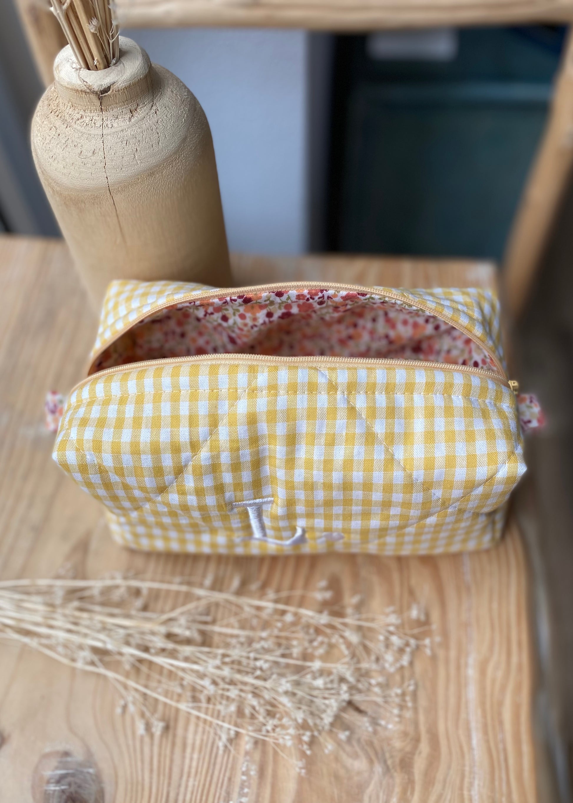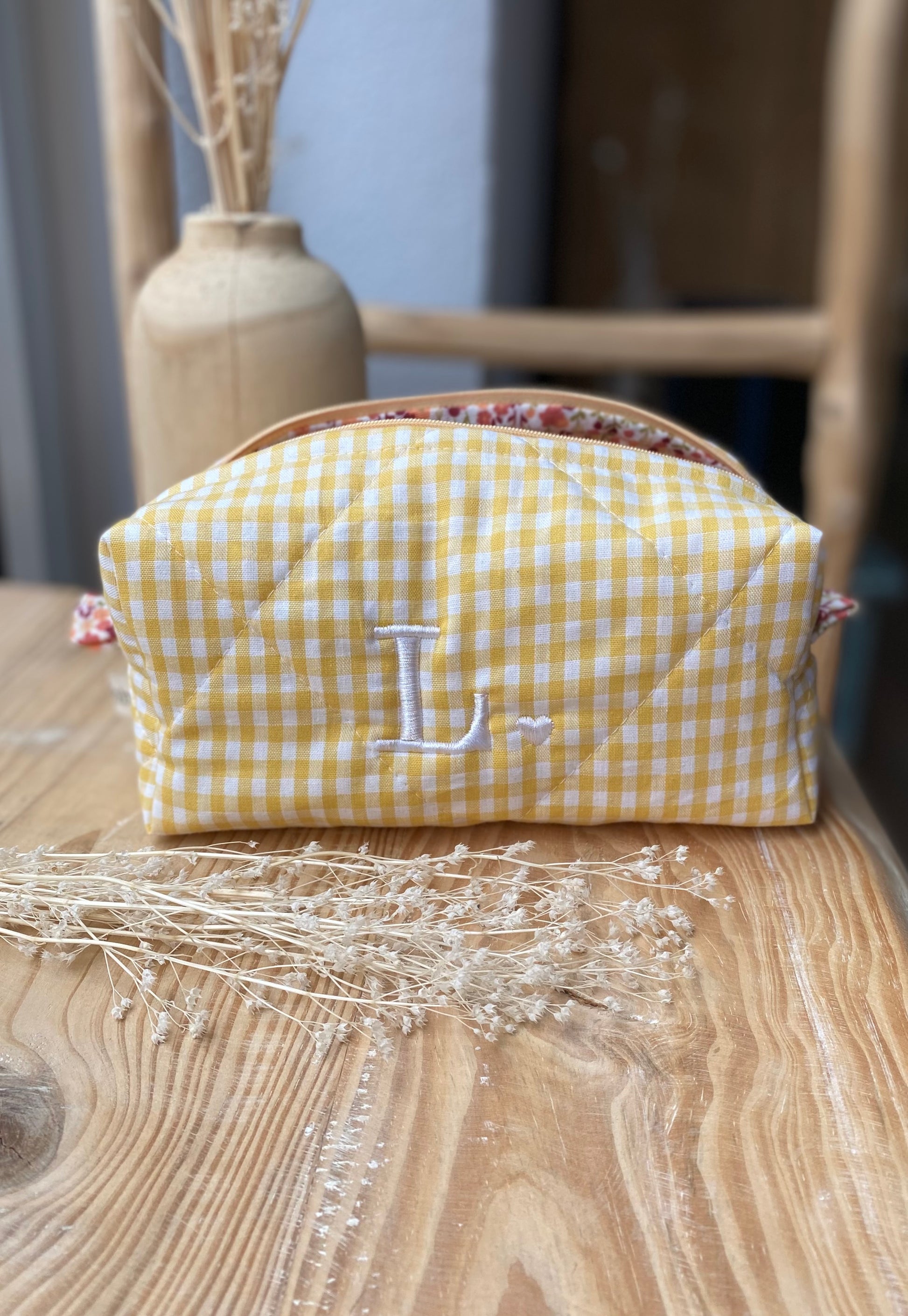 Cubotto in cotone vichy giallo, personalizzato con iniziale L, realizzabile con qualsiasi iniziale o nome.