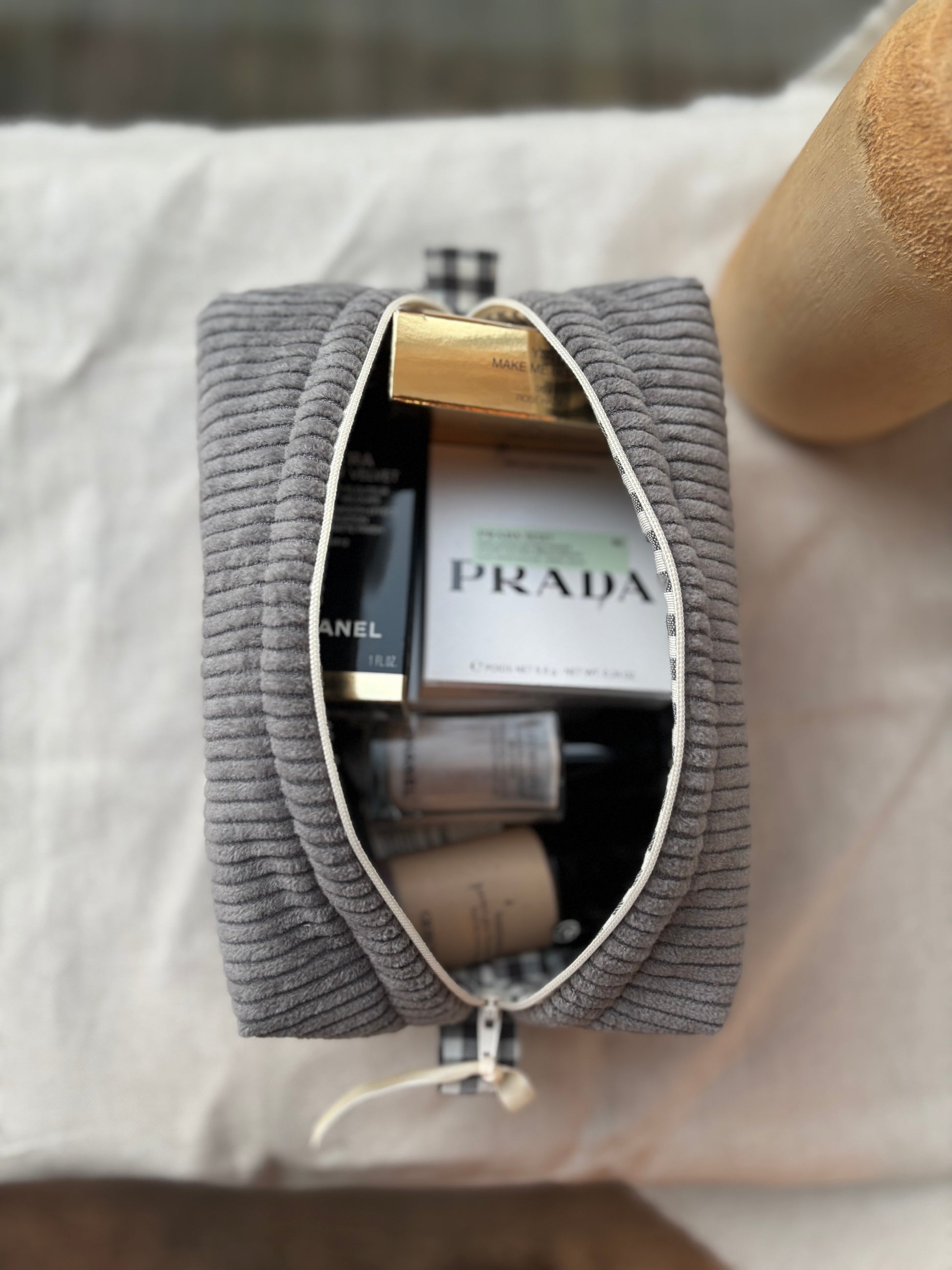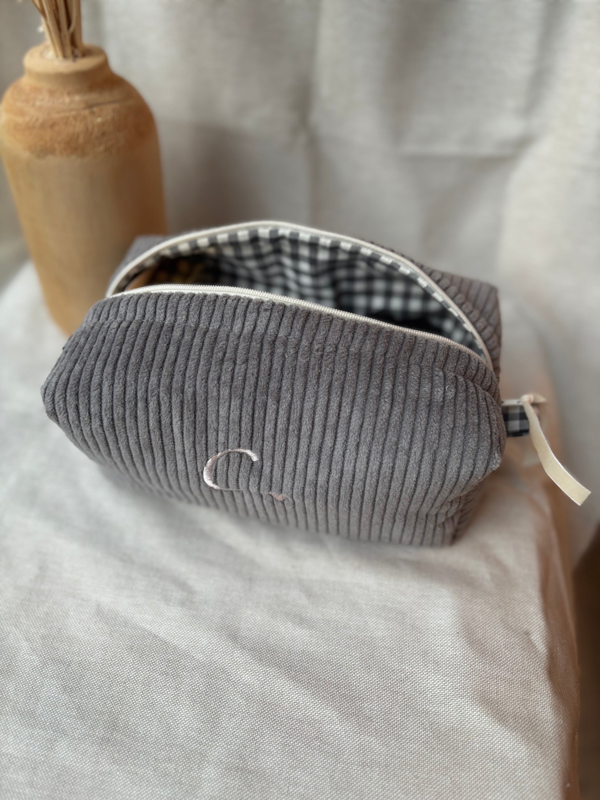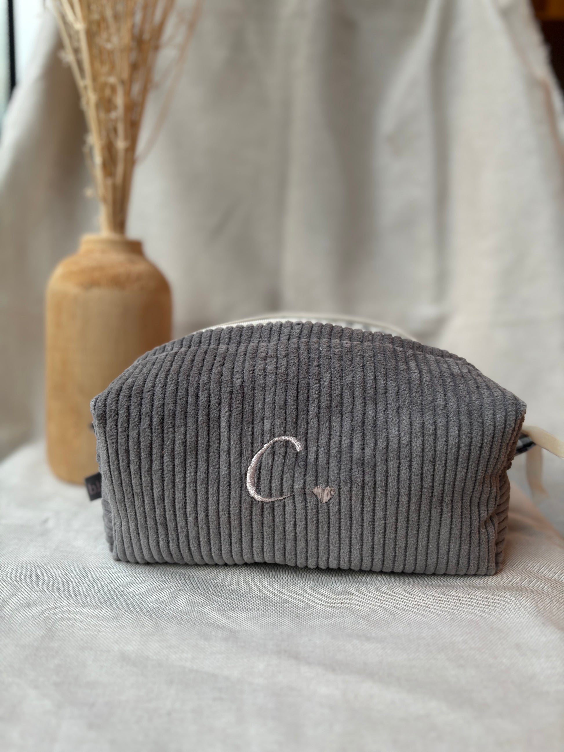 Cubotto in velluto grigio a costine personalizzato con iniziale C, realizzabile con qualsiasi inziale o nome.