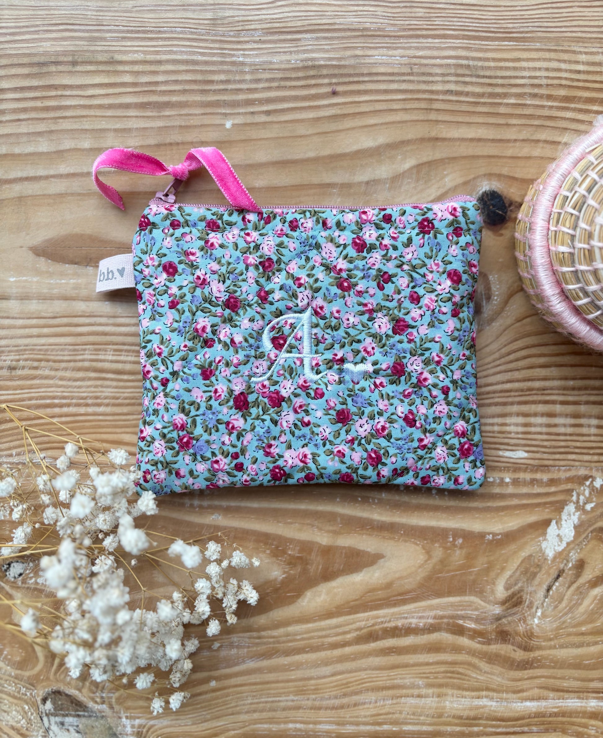Mini pochette in cotone personalizzata con iniziale A, realizzabile con qualsiasi iniziale o nome.