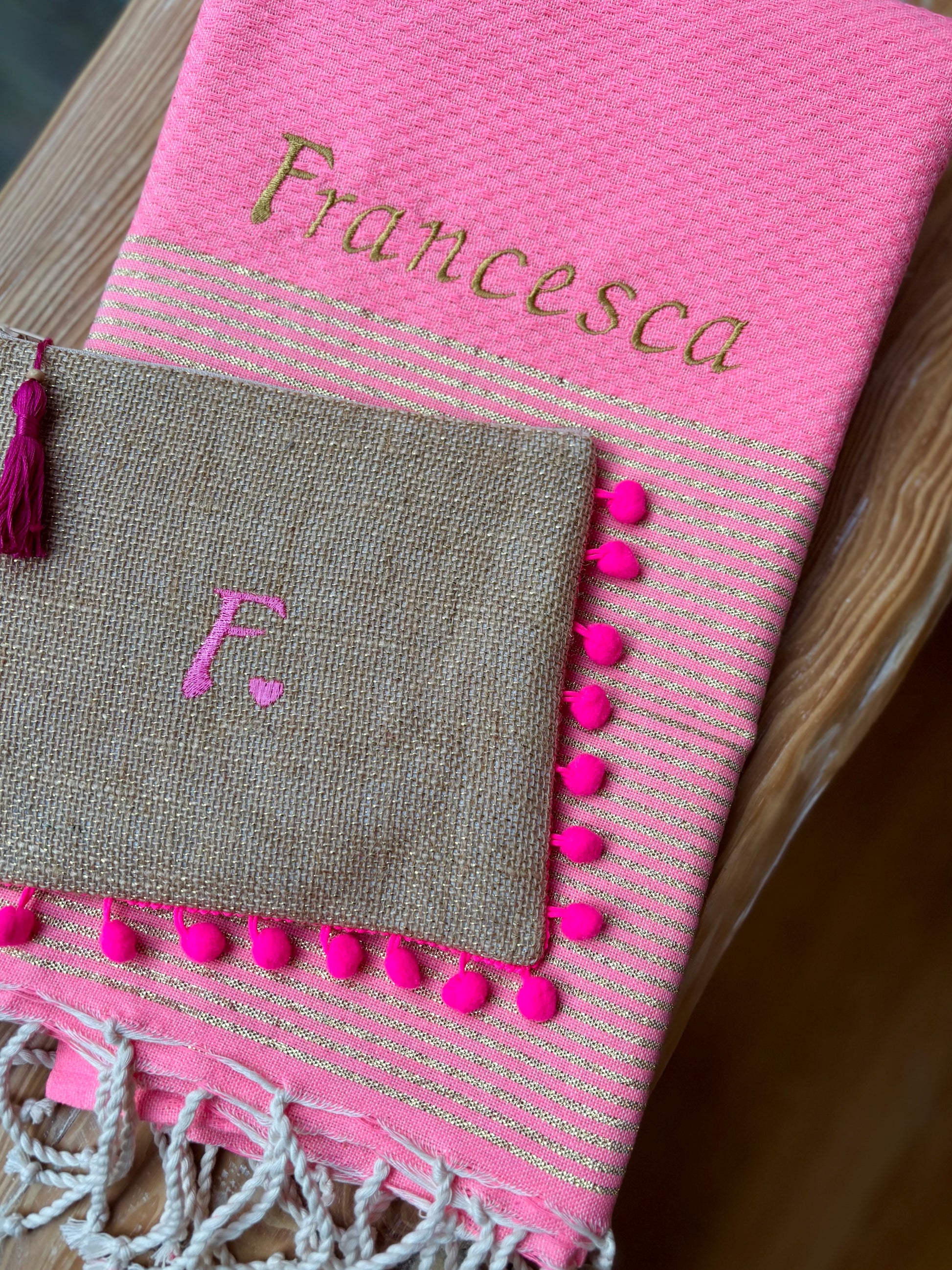 Telo mare fouta personalizzato con nome, realizzabile con qualsiasi iniziale o nome.