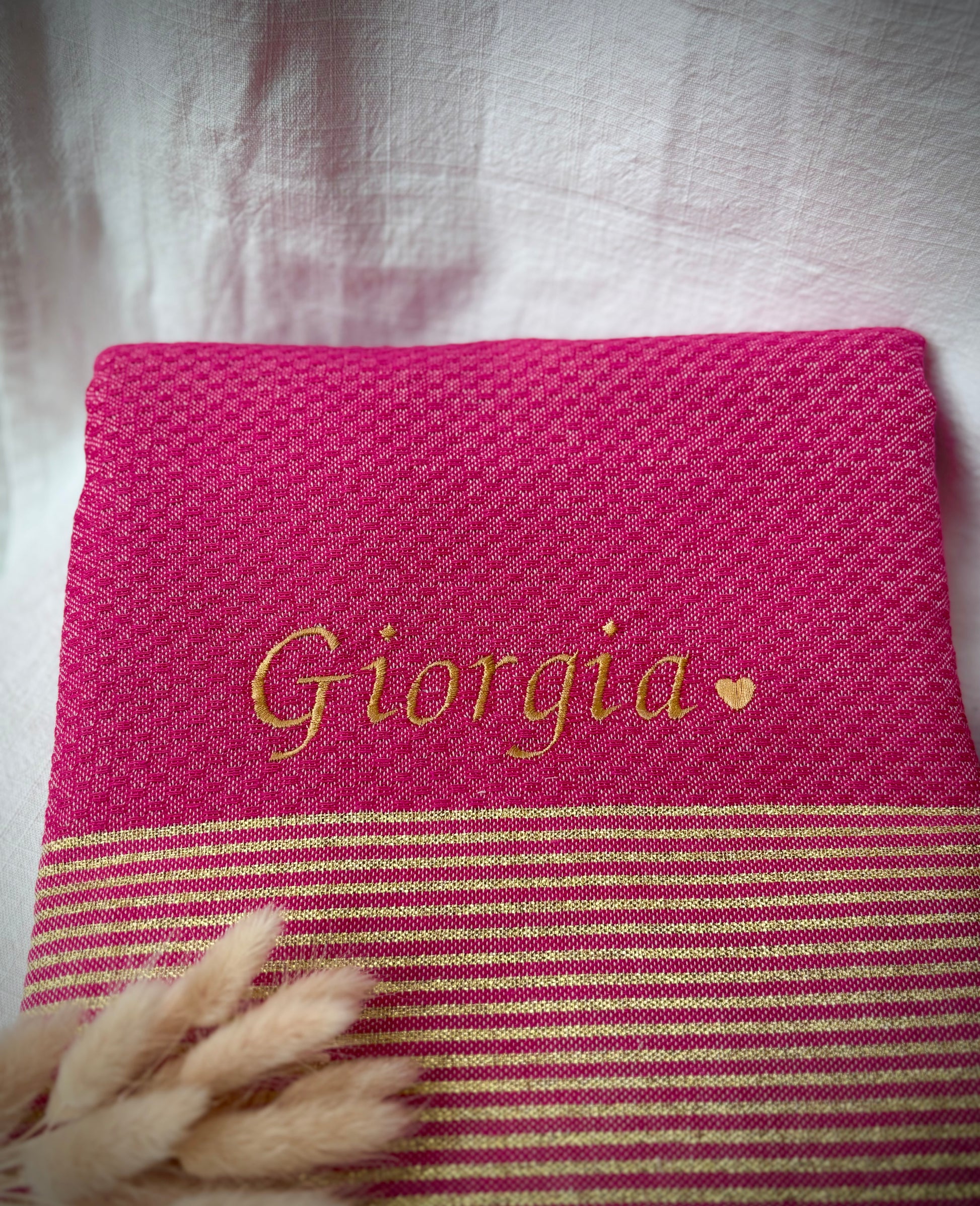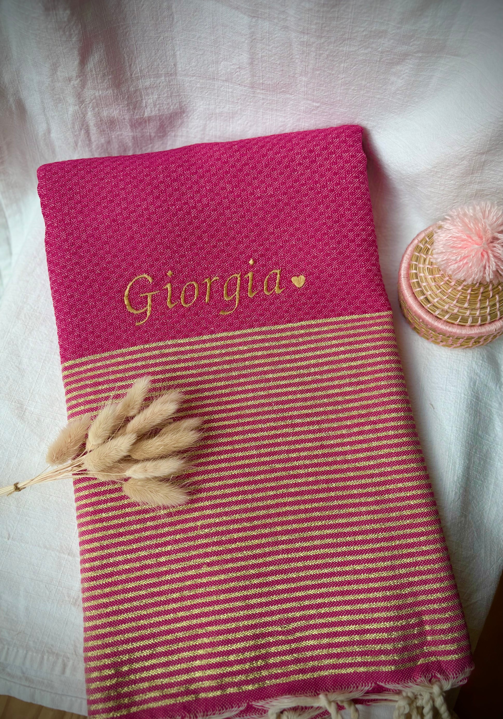 Telo mare fouta fuxia con righe oro personalizzato con nome, realizzabile con qualsiasi nome o iniziale.