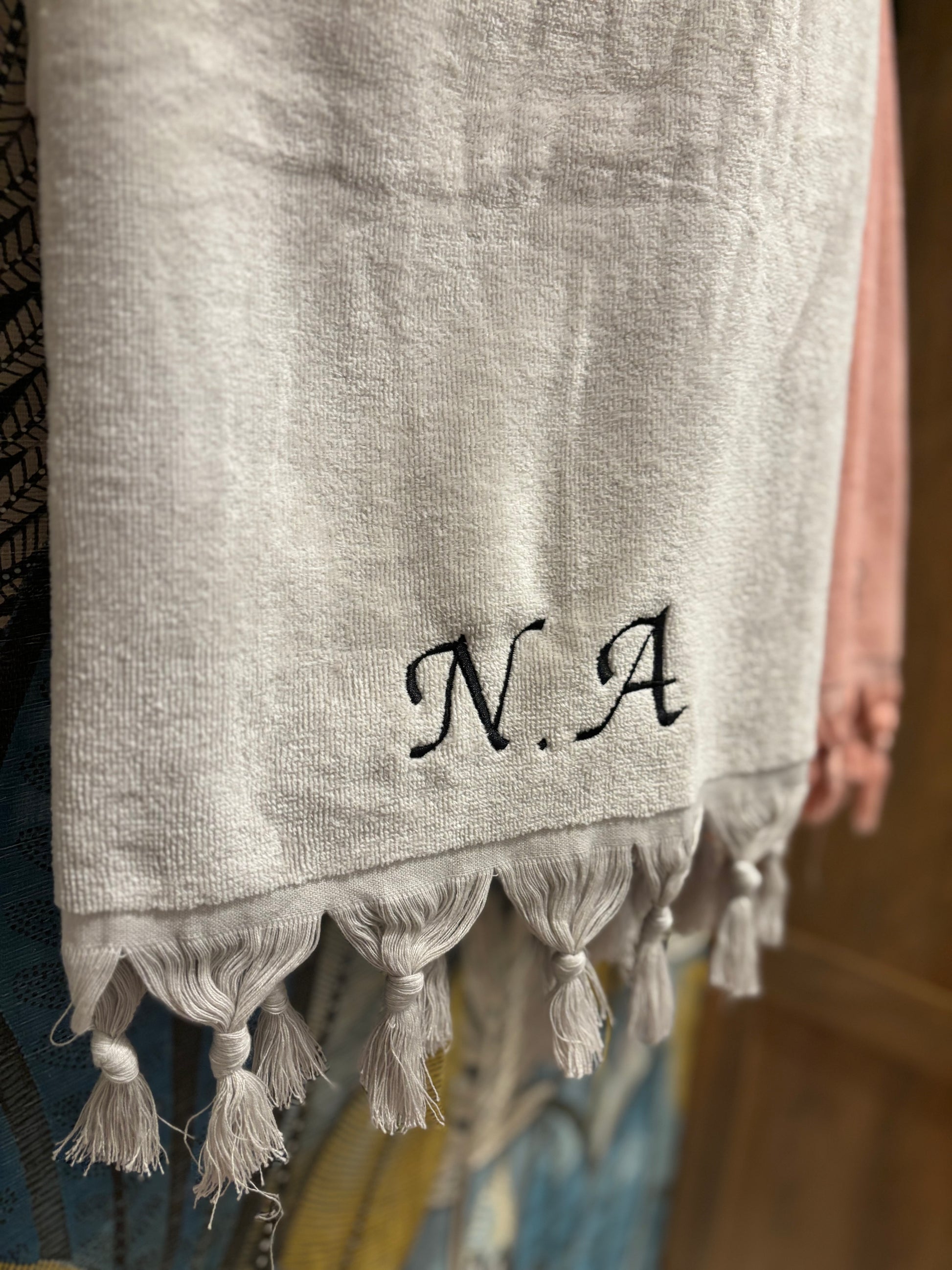 Telo mare in spugna bamboo colore ghiaccio/beige personalizzato con iniziale, realizzabile con qualsiasi iniziale o nome.