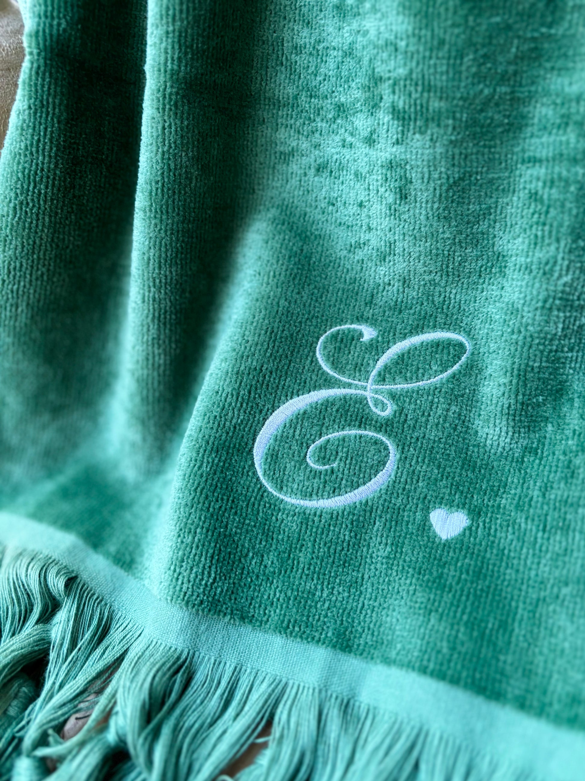 Telo mare in spugna bamboo verde personalizzato con iniziale E, realizzabile con qualsiasi iniziale o nome.